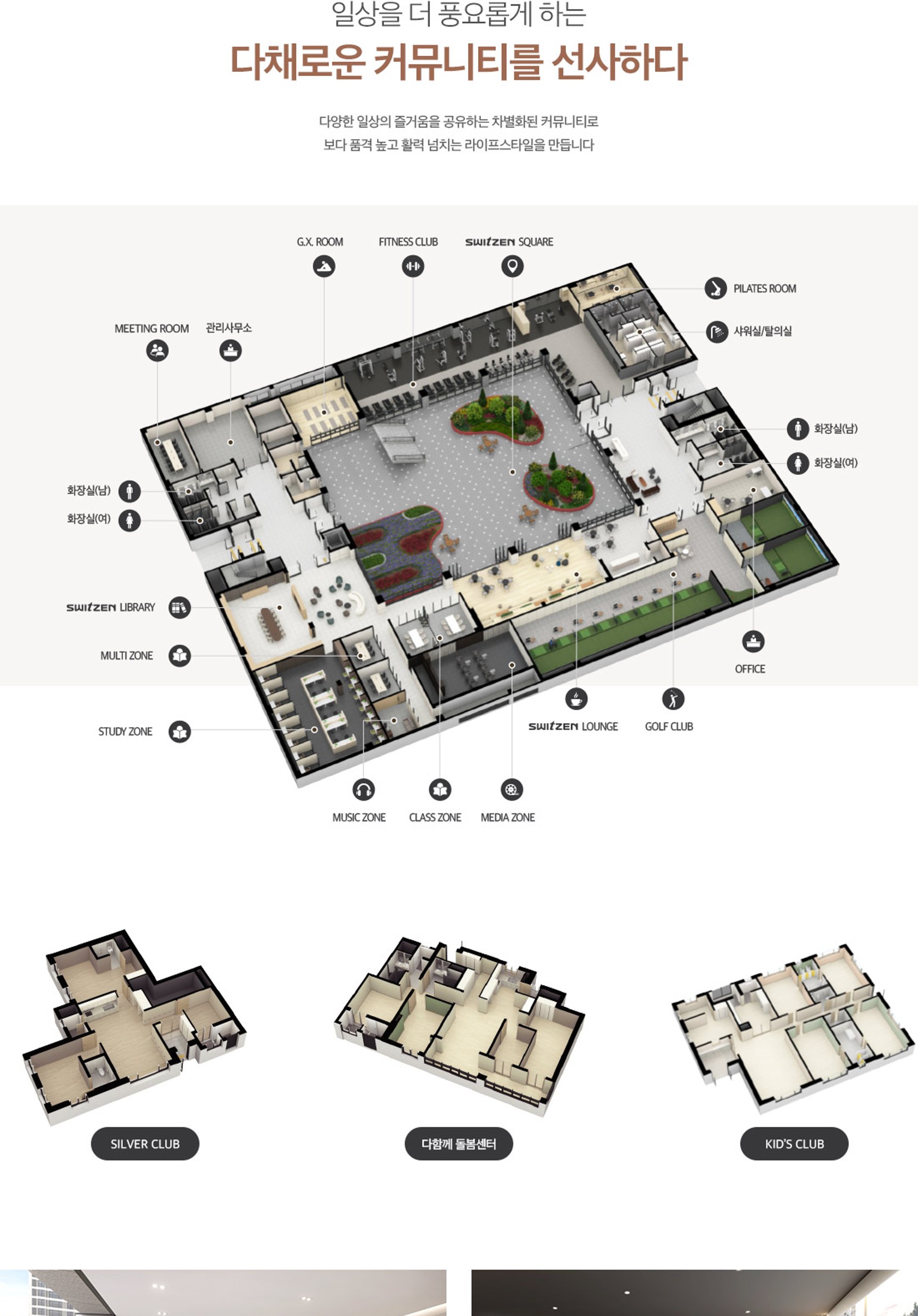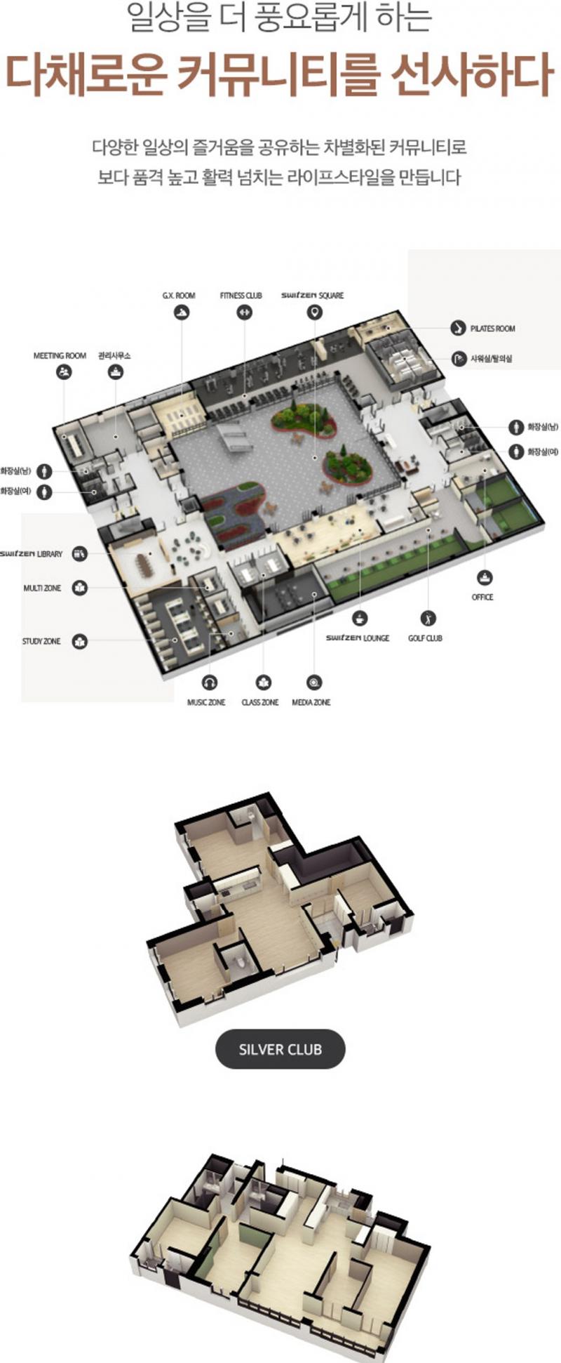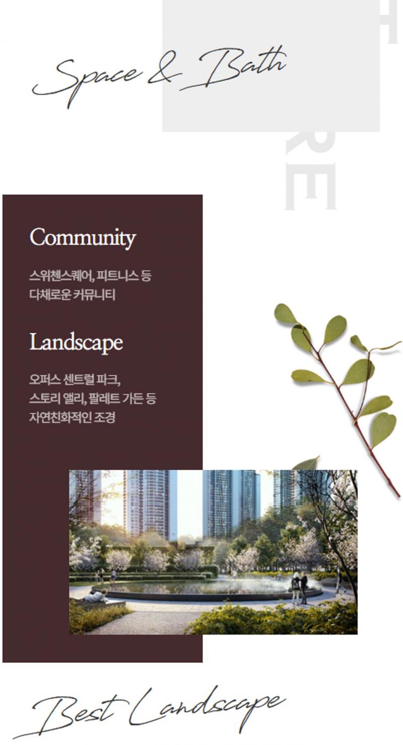 - ※ 상기 커뮤니티 ISO, 투시도 CG 등은 소비자의 이해를 돕기 위해 사전에 개략적으로 제작된 것으로 외부색채 및 입면, 마감재, 조경, 측벽 그래픽 및 사인, 기타 외부사항 등은 인·허가, 색채심의 및 설계 변경, KCC건설 디자인 기준 등으로 인해 실제 시공 시 변경될 수 있습니다.